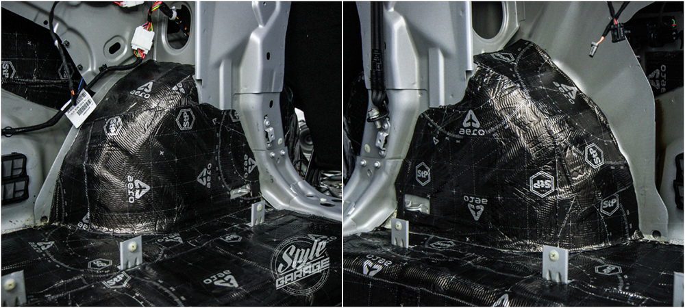4. Далее оклеиваются колесные арки. Задние крылья со стороны салона обрабатываются аналогично, особое внимание уделяется технологическим отверстиям и ребрам жесткости, которые предстоит закрыть. В данном случае в LADA Vesta применяется многослойный подход: первым слоем покрываем поверхности вибропоглощающим материалом Onyx 4 мм с мастичной структурой. Второй слой также – звукоизоляционное покрытие Base или Barrier Mix из плотного вспененного материала.